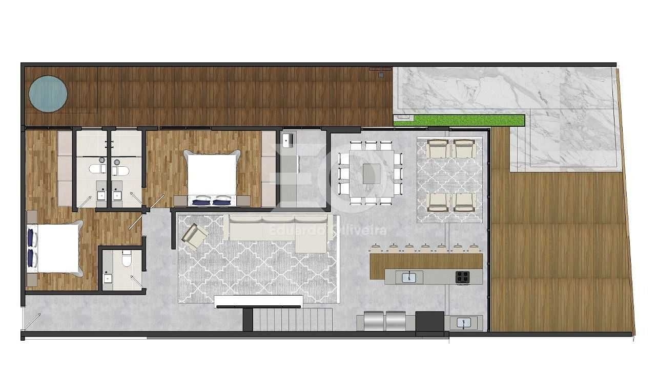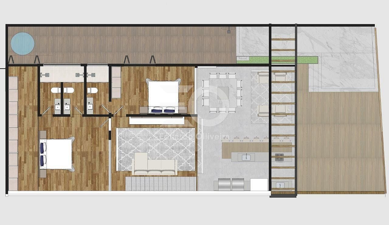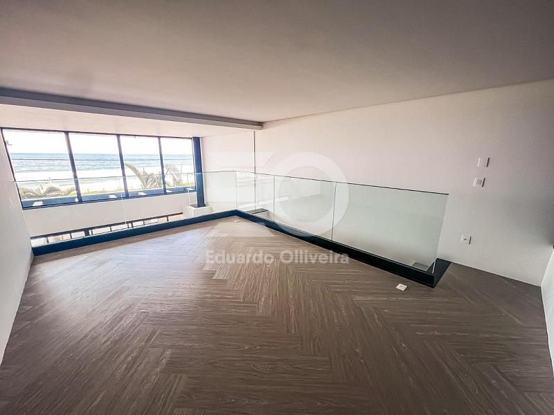 O pavimento superior é um verdadeiro refúgio privativo. Um estar íntimo no mezanino cria um ambiente acolhedor e exclusivo, enquanto as duas suítes superiores surpreendem com grandes aberturas voltadas para o mar. A suíte principal se destaca pelo banheiro Sr. e Sra., oferecendo ainda mais conforto, privacidade e sofisticação. O terraço frente mar complementa o cenário com uma vista deslumbrante e permanente, elevando o conceito de morar bem.