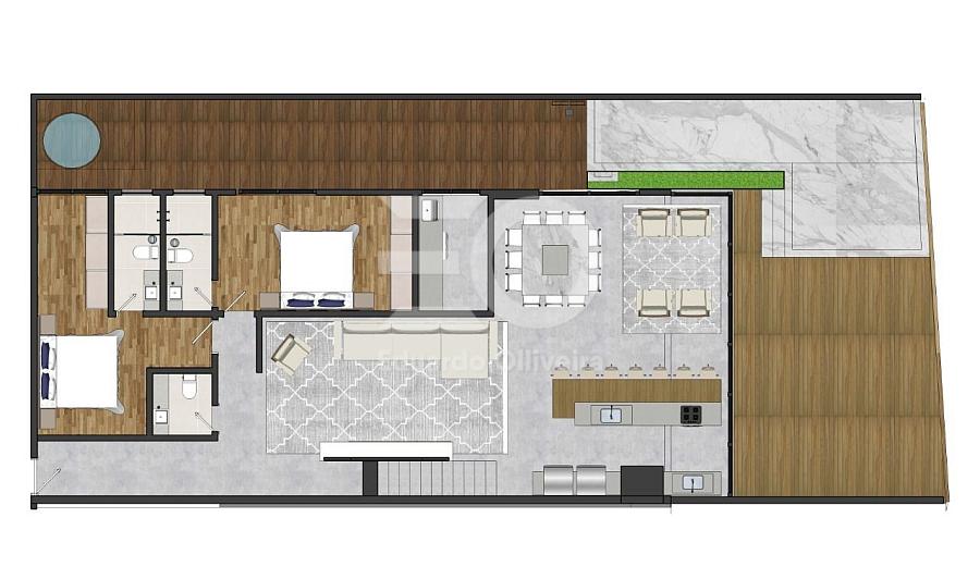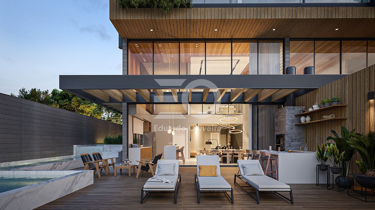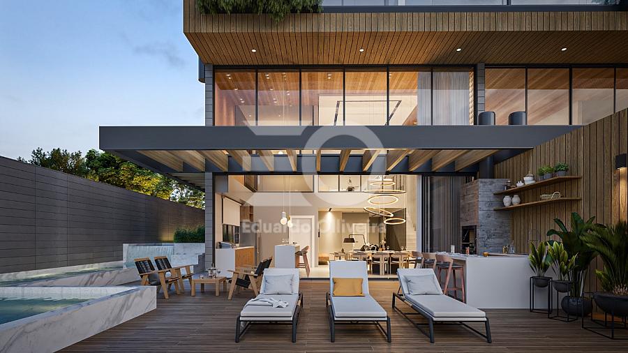 No pavimento inferior, além do living integrado, o imóvel dispõe de duas suítes confortáveis, sendo uma delas com espera para ofurô, lavabo, área de serviço ampla e isolada, além de acabamentos que reforçam o padrão elevado, como aquecimento a gás, gás individual e infraestrutura completa para conforto térmico e funcional.