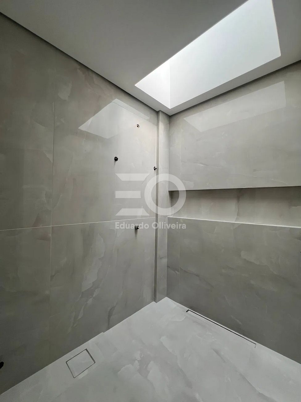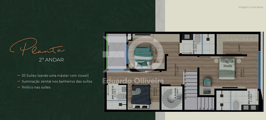 No pavimento superior, a área íntima oferece três suítes bem distribuídas, sendo uma master com closet, proporcionando conforto, privacidade e bem-estar. Os banheiros contam com iluminação zenital, trazendo mais luz natural e valorizando os ambientes, enquanto o piso vinílico nas suítes garante aconchego e elegância.